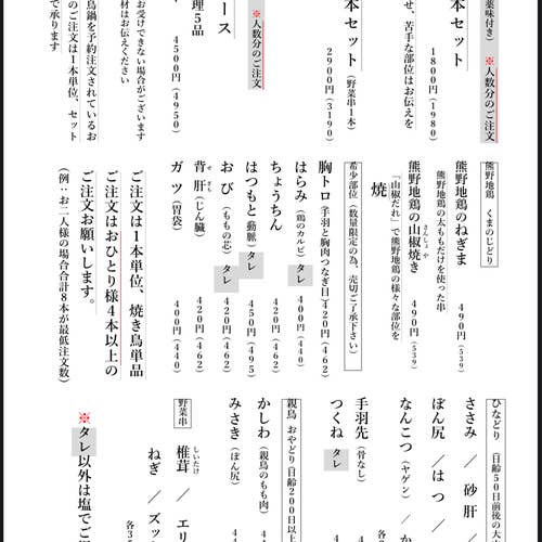 | 座席 | 17席 カウンターあり (テーブル席×3 カウンター席×4 ※7名様以上のご予約はコース(焼き鳥5本セット、おまかせ料理5品等)でのご案内となります。) |
